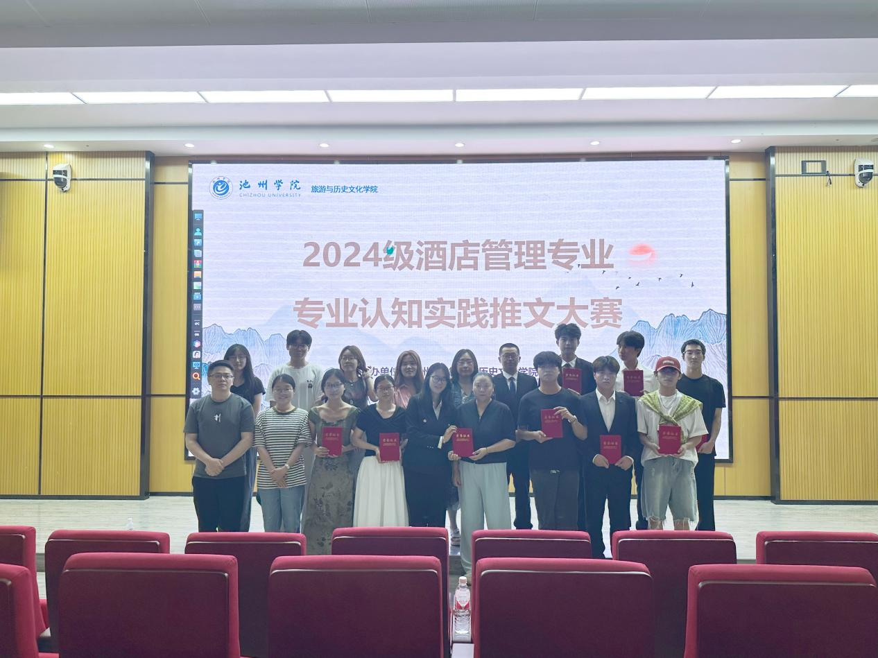 大赛设置PPT汇报和才艺展示两个环节,由5位专业教师担任评委。8支参赛队伍围绕酒店设计、服务、餐饮等主题进行精彩展示。才艺环节中,同学们通过歌舞、情景剧等形式生动演绎酒店文化。经过评比,《解锁池州:枕山眠水,睡进山水池州》获一等奖,胡文豪同学荣获最佳台风奖。评委组长余菲菲对比赛进行总结点评,充分肯定了同学们的创新思维与实践能力,并鼓励大家继续探索新媒体与酒店管理的融合应用。