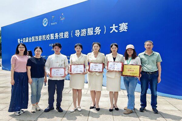 5月23日-26日,第十四届全国旅游院校服务技能(导游服务)大赛在河南郑州举办。经过激烈的角逐,我校2021级旅游管理对口班陈双晴、2023级旅游管理对口2班何家豪分别获得全国高等院校普通话组二、三等奖,2021级旅游管理1班刘庆、2022级旅游管理1班程毓琪获得全国高等院校英语组三等奖,团队总成绩排名全国前20%,荣获大赛团体奖。