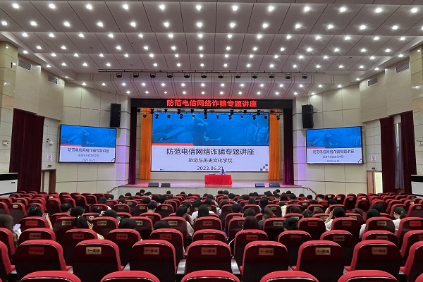 6月21日下午,2138CC太阳集团在博古礼堂开展防范电信网络诈骗专题讲座。专题讲座邀请了驻校警务站陶德兵警官主讲,各班级学生代表参加。