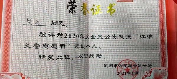 为深入推进坚持和发扬新时代“枫桥经验”,进一步弘扬“共治、正义、勇敢、奉献”志愿服务精神,贵池区公安分局对2020年贵池区实名注册的“江淮义警志愿者”进行评选表彰。