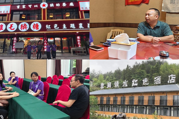 实践团还聚焦红色文旅融合业态,探访“云间请水”红色主题酒店与“鸡毛换糖”红色主题餐厅。“云间请水”酒店负责人黄总介绍,酒店将红色文化融入住宿、餐饮等服务,不仅为游客打造沉浸式红色体验,还带动周边村民就业及农副产品销售;“鸡毛换糖”餐厅则通过收集红色文物,以革命事件命名包厢、悬挂革命宣言,创新“红色餐厅+展厅”模式,拉动当地消费的同时,让红色文化更接地气。