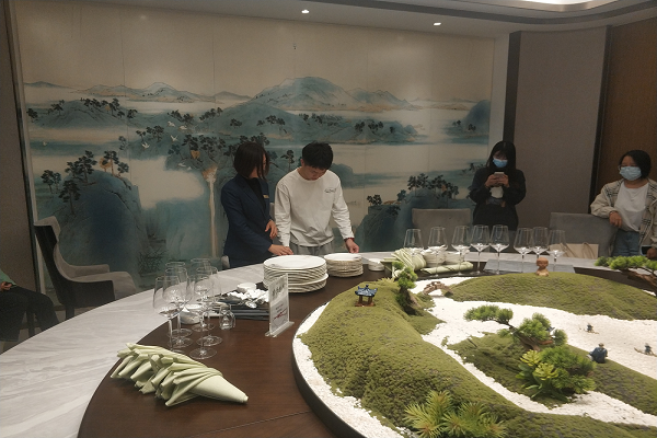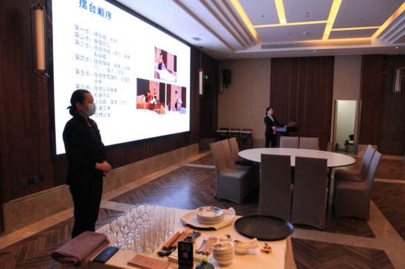 在企业课堂上,平天半岛大酒店餐饮部孙经理讲解了中餐摆台的步骤及注意事项、红葡萄酒和白酒斟酒服务操作规范、托盘操作以及不同盘花折法。
