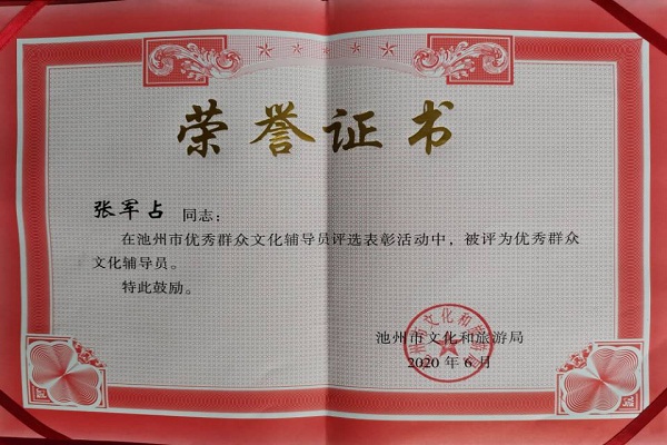 根据池州市文化和旅游局下发的《关于池州市优秀群众文化辅导员评选表彰的通报》,我院张军占老师荣获了池州市“优秀群众文化辅导员”称号。