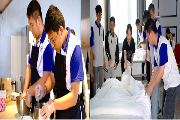 同学们在餐饮实训室观摩体验了生活劳动——食品和饮品制作。毛家骅教授和酒店管理专业的学生志愿者为同学们介绍了咖啡和糕点制作相关知识,带领同学们制作咖啡和小饼干等饮品食品。等待饼干完成烘焙的过程中,同学们在客房实训室跟着学生志愿者一起开展了生活劳动——内务整理,同学们学会了“铺床叠被”的专业技巧,在笑声和掌声中开展了一场内务技能比拼。