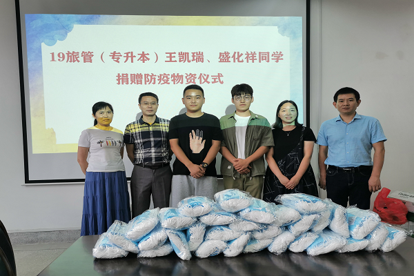 会后,院领导班子代表学院接收了19旅管(专升本)班王凯瑞、盛化祥两位同学捐赠的防疫物资。